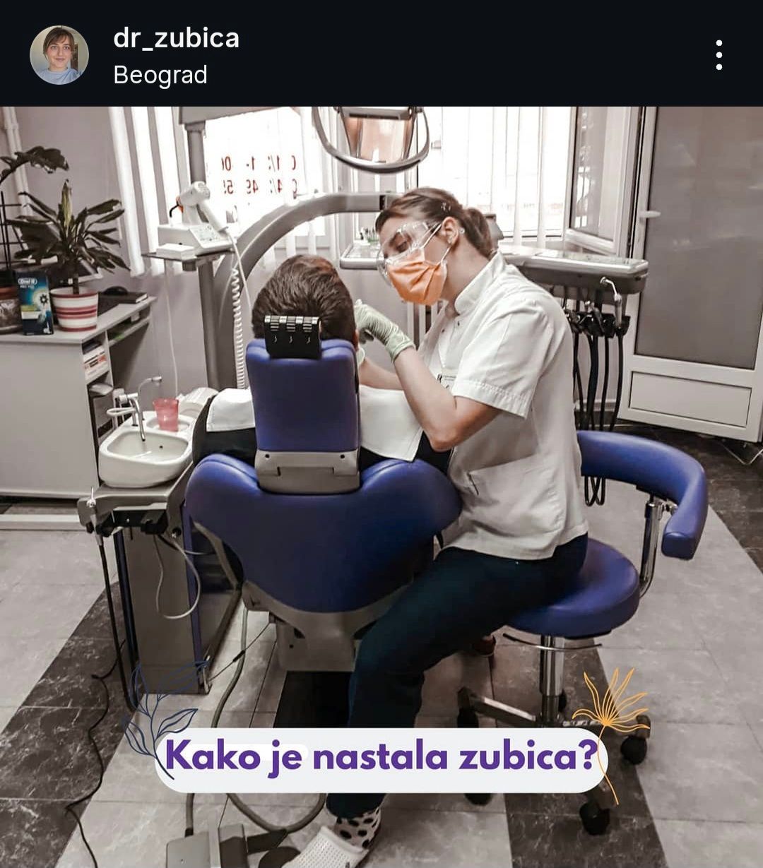 Kao i svaka dobra instagramerka, imala sam uho za svoje ljude na profilu i posebnu pažnju dala oralnoj higijeni kod dece, kako pripremiti decu za odlazak kod zubara i time prekinuti prenošenje transgeneracijskog straha od stomatologa. Možda sam uzela preveliki zalogaj, ipak su to traume koje su se prenosile sa kolena na koleno još od kada su se berberi bavili ekstrakcijom zuba. Sa tim u vezi, kontaktirala sam psihoterapeutkinju koja je prevashodno